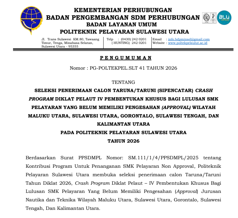 Selamat Datang di Website Politeknik Pelayaran Sulawesi Utara