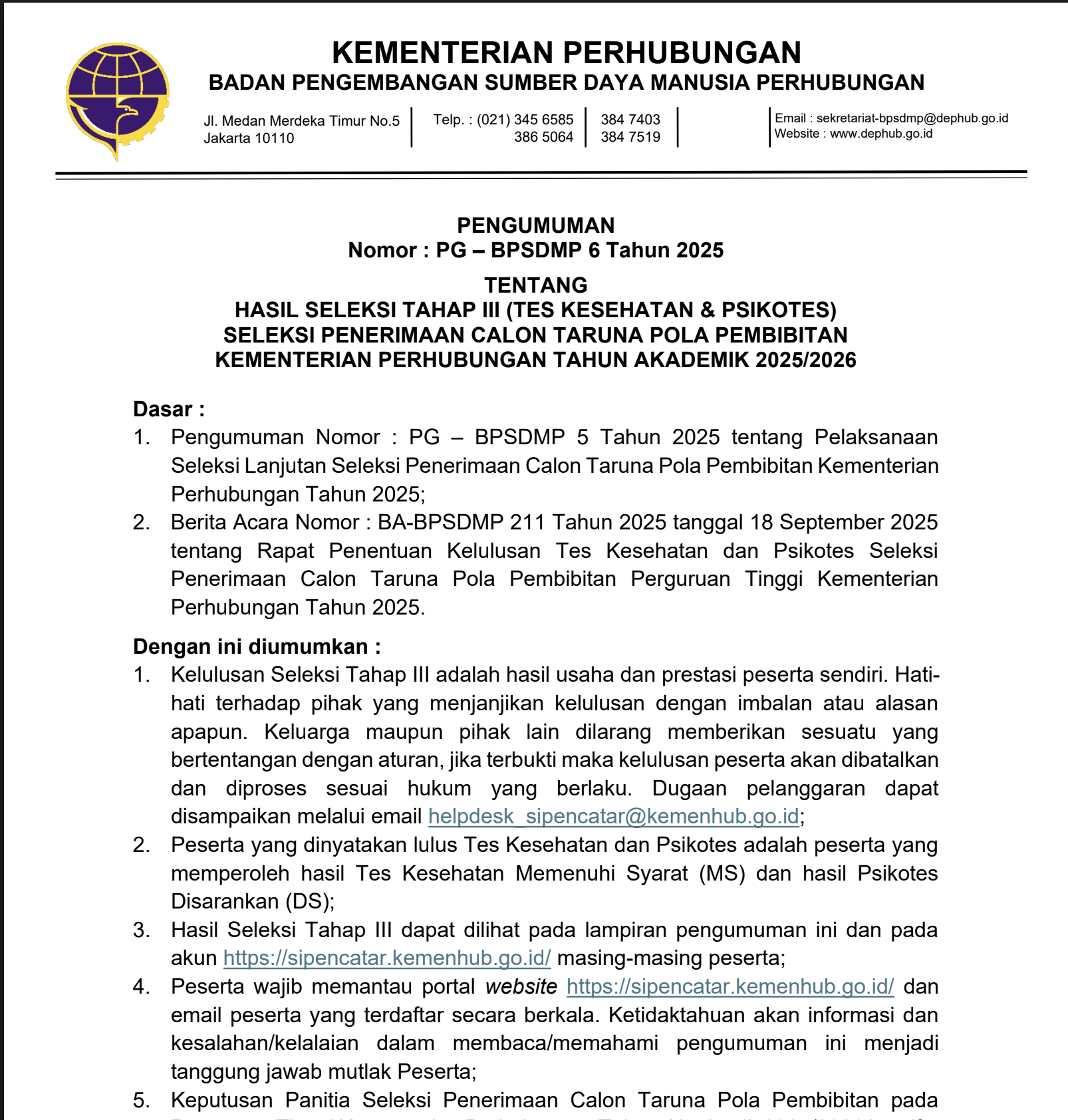 SELEKSI PENERIMAAN CALON TARUNA/TARUNI (SIPENCATAR) PROGRAM DIPLOMA III (D-III) MANDIRI JALUR PRESTASI PADA POLITEKNIK PELAYARAN SULAWESI UTARA TAHUN AKADEMIK 2025/2026June 16, 2025PENGUMUMAN HASIL SELEKSI TAHAP III (TES KESEHATAN & PSIKOTES) SELEKSI PENERIMAAN CALON TARUNA POLA PEMBIBITAN KEMENTERIAN PERHUBUNGAN TAHUN AKADEMIK 2025/2026September 19, 2025 Show all PENGUMUMAN : PELAKSANAAN SELEKSI LANJUTAN JALUR POLA PEMBIBITAN PADA PERGURUAN TINGGI KEMENTERIAN PERHUBUNGAN POLITEKNIK PELAYARAN SULAWESI UTARA TAHUN AKADEMIK 2025/2026 September 4, 2025 Jumlah Pengunjung: 2,930 Share Related postsSeptember 19, 2025PENGUMUMAN HASIL SELEKSI TAHAP III (TES KESEHATAN & PSIKOTES) SELEKSI PENERIMAAN CALON TARUNA POLA PEMBIBITAN KEMENTERIAN PERHUBUNGAN TAHUN AKADEMIK 2025/2026Read moreJune 16, 2025SELEKSI PENERIMAAN CALON TARUNA/TARUNI (SIPENCATAR) PROGRAM DIPLOMA III (D-III) MANDIRI JALUR PRESTASI PADA POLITEKNIK PELAYARAN SULAWESI UTARA TAHUN AKADEMIK 2025/2026Read moreSeptember 6, 2024PESERTA YANG DINYATAKAN LULUS SELEKSI ADMINISTRASI GELOMBANG I PROGRAM DIKLAT PELAUT IV JALUR MANDIRI PADA PERGURUAN TINGGI DI LINGKUNGAN KEMENTERIAN PERHUBUNGAN POLITEKNIK PELAYARAN SULAWESI UTARA TAHUN AKADEMIK 2024/2025Read more
